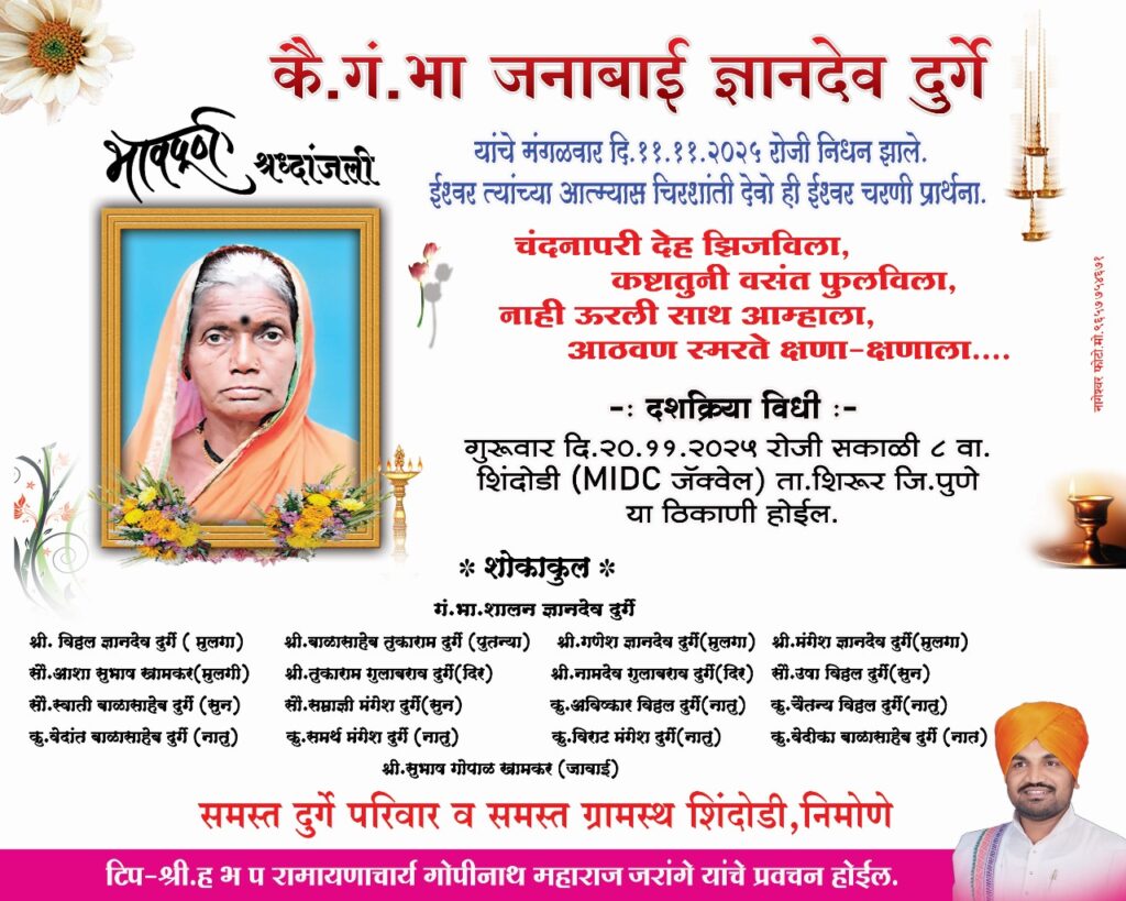 शिंदोडी येथील जनाबाई दुर्गे यांचे निधन मुख्य बातम्या शिरूर तालुका नोव्हेंबर 19, 2025नोव्हेंबर 19, 2025शिरूर तालुका टीम शिंदोडी (प्रतिनिधी) येथील जनाबाई ज्ञानदेव दुर्गे यांचे नुकतेच अल्पशा आजाराने निधन झाले. त्यांच्या पश्चात एक मुलगा, सुन, मुलगी, जावई, नातवंडे, असा परीवार आहे. शिंदोडी विविध कार्यकारी सहकारी सोसायटीचे उपाध्यक्ष विठ्ठल दुर्गे यांच्या त्या मातोश्री होत.