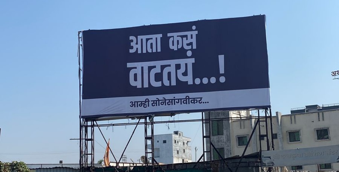 शिरुर (तेजस फडके) शिरुर तालुक्यात नुकत्याच चार गावच्या ग्रामपंचायत निवडणुकीत सोनेसांगवी ग्रामपंचायतमध्ये बाळासाहेबांची शिवसेना गटाच्या महिलेची सरपंचपदी वर्णी लागली असुन अत्यंत चुरशीच्या झालेल्या निवडणुकीत शिंदे गटाचे माजी खासदार शिवाजीराव आढळराव पाटील, युवासेनेचे पुणे जिल्हाध्यक्ष बापु शिंदे यांनी या गावातील कार्यकर्त्यांना ताकत दिल्याने निवडणुकीत रंगत आली. परंतु राष्ट्रवादीच्या शिरुर-आंबेगावच्या एका बड्या नेत्याने सोनेसांगवी गावच्या ग्रामपंचायत निवडणुकीत लक्ष घातल्याने अनेक नाट्यमय घडामोडी घडल्या. त्यामुळे सरपंचपद जिंकलेल्या गटाने पुणे-नगर रस्त्याच्या कडेलाच राजमुद्रा चौकात मोठा बॅनर लावला असून त्या ‘बॅनर’ वर “आता कस वाटतय” ‘आम्ही सोनेसांगवीकर’ असा मजकुर असल्याने या बॅनरची चर्चा सगळ्या तालुकाभर सुरु आहे.