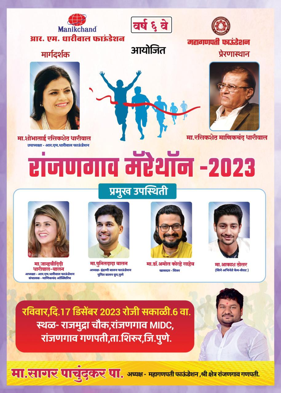 ‘रांजणगाव मॅरेथॉन 2023 ‘ हि स्पर्धा उद्या रविवार (दि 17) रोजी रांजणगाव एमआयडीसी येथील छत्रपती शिवाजी महाराज चौक (राजमुद्रा चौक) येथे होणार असुन या स्पर्धेसाठी शिरुरचे खासदार अभिनेते डॉ अमोल कोल्हे, आर एम धारीवालच्या अध्यक्षा जान्हवी धारीवाल-बालन, उपाध्यक्षा शोभा धारीवाल, इंद्राणी बालन फाउंडेशनचे अध्यक्ष पुनित बालन, सैराट फेम अभिनेता आकाश ठोसर तसेच अनेक मान्यवर उपस्थित राहणार आहेत. या मॅरेथॉन स्पर्धेचे आयोजन महागणपती फाऊंडेशनचे अध्यक्ष सागर पाचुंदकर यांनी केले असुन या स्पर्धेची सुरवात सकाळी 6 वाजता मान्यवरांच्या हस्ते ध्वज फडकवुन होणार आहे.
