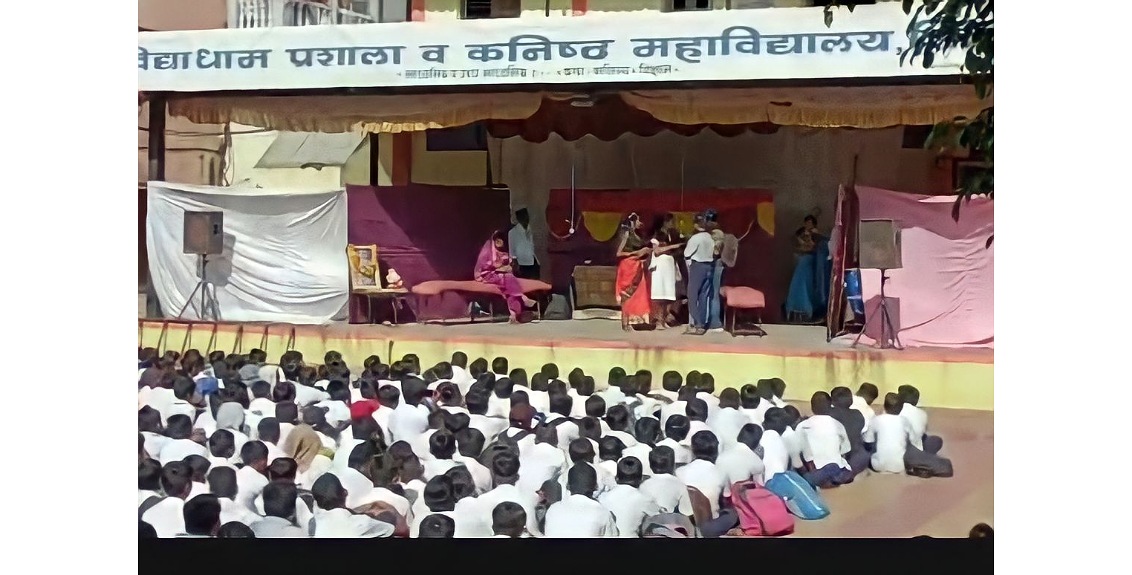 शिक्रापूर (शेरखान शेख): शिक्रापूर (ता.शिरुर) येथील विद्याधाम प्रशालेत गणेश उत्सवात सांस्कृतिक कार्यक्रमाचे आयोजन करण्यात आले असता मोबाईल बाप्पा आले घरा या नाटकाने मनोरंजन तर केलेच पण मोबाईलचे नवीन पिढीवर होणारे दुष्परिणाम फार प्रभावीपणे मांडण्यात आले असून सदर नाटकाच्या आशयाने आणि विद्यार्थ्यांच्या अभिनयाने प्रेक्षकांची मने जिंकली.