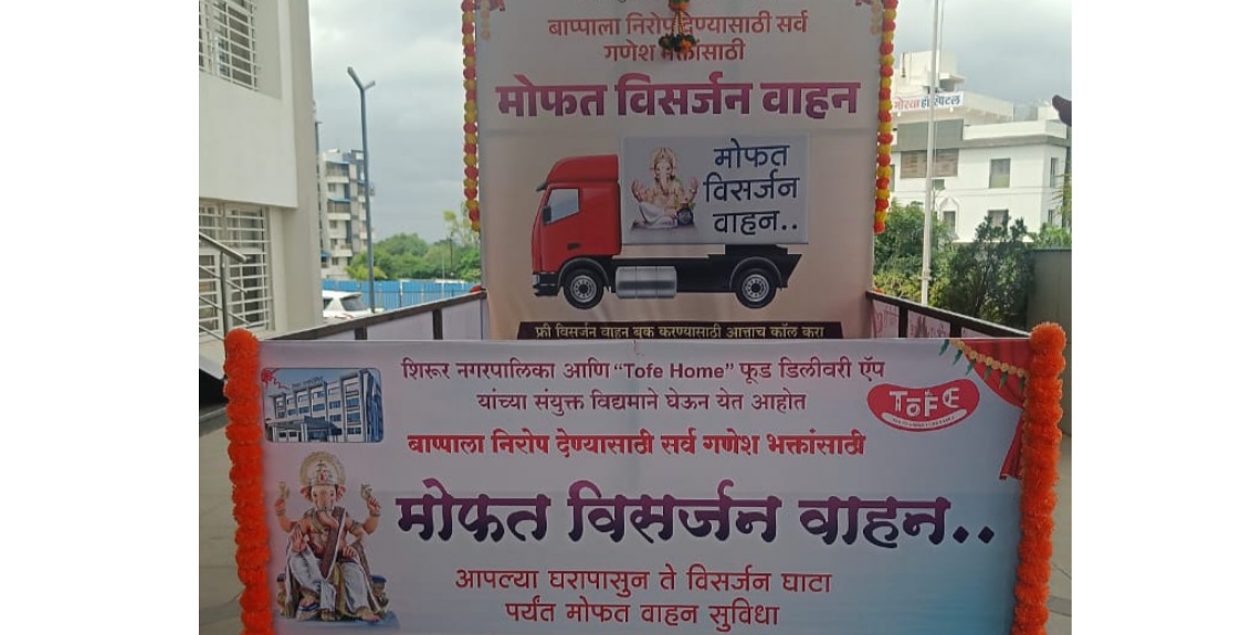 शिरूर नगरपरिषद आणि टोफे होम फूड डिलिव्हरी ॲप यांच्या संयुक्त विद्यमाने एक आगळावेगळा उपक्रम हाती घेण्यात आला आहे. यामध्ये गणेशभक्तांना घरापासून विसर्जन घाटापर्यंत मोफत वाहन सुविधा उपलब्ध करून दिली जात आहे.
