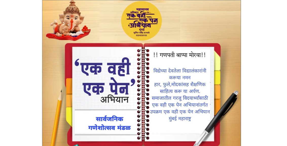 मुंबई: समाजातील गरजू आणि होतकरू विद्यार्थ्यांना मदतीचा हात म्हणून येत्या गणेशोत्सवात विद्येची देवता गणरायाचरणी हार, फुले, मोदकांसह वह्या पेन, पेन्सिल व शैक्षणिक साहित्य अर्पण करून समाजातील गरजू विद्यार्थ्यांच्या शिक्षणासाठी हातभार लावावे असे आवाहन ‘एक वही एक पेन अभियान’ व ‘सुमनालय फाउंडेशन’ च्या वतीने राज्यातील गणेशभक्त व गणेश मंडळांना करण्यात आले आहे. येत्या २७ ऑगस्ट रोजी […]